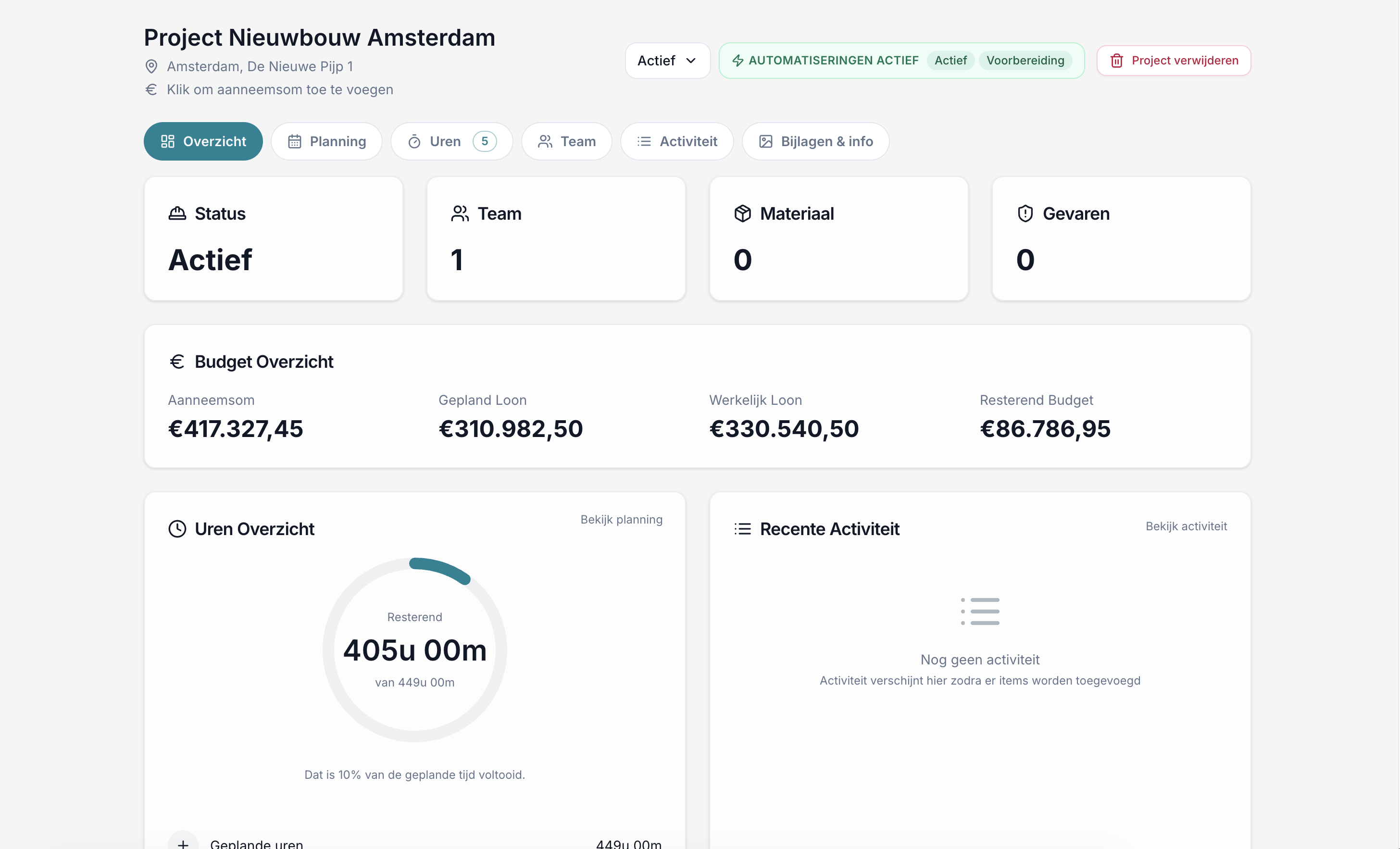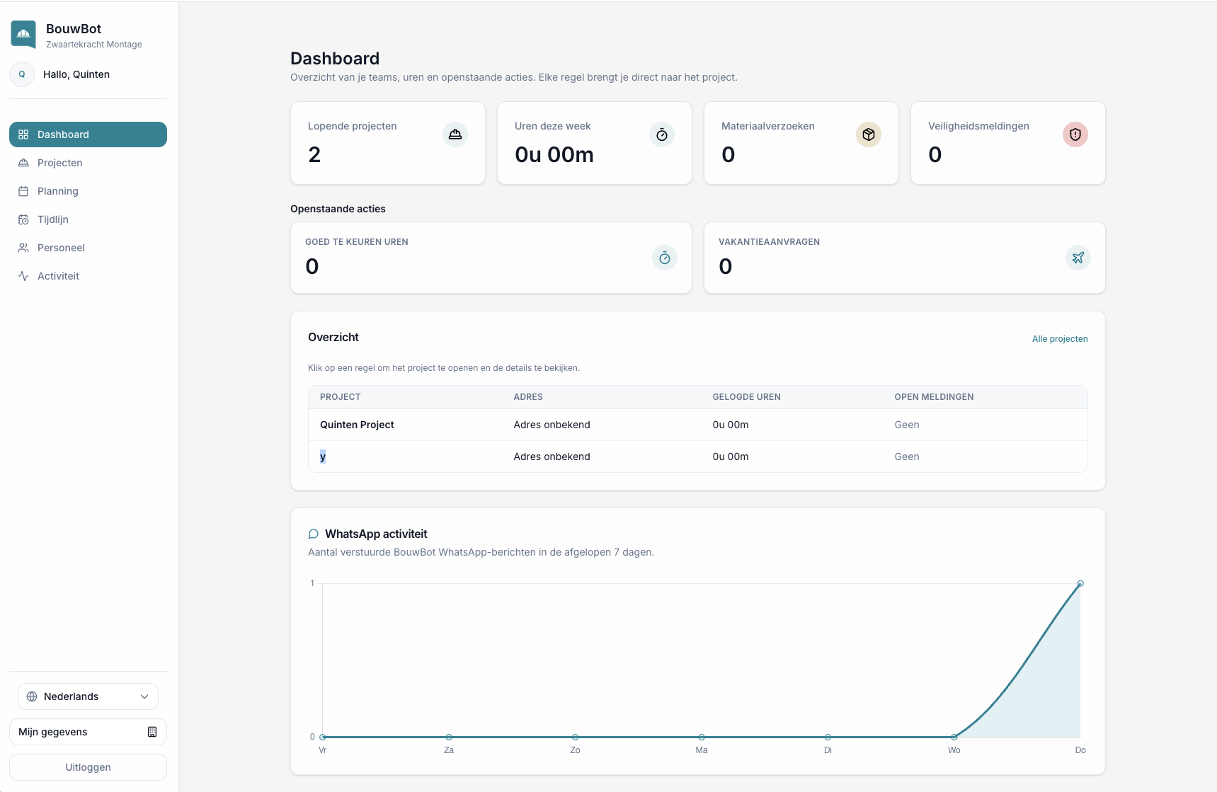 Managers hebben meestal binnen een uur overzicht van projecten, uren en kosten. Medewerkers gebruiken gewoon WhatsApp. Geen trainingstrajecten of handleidingen van 40 pagina’s.