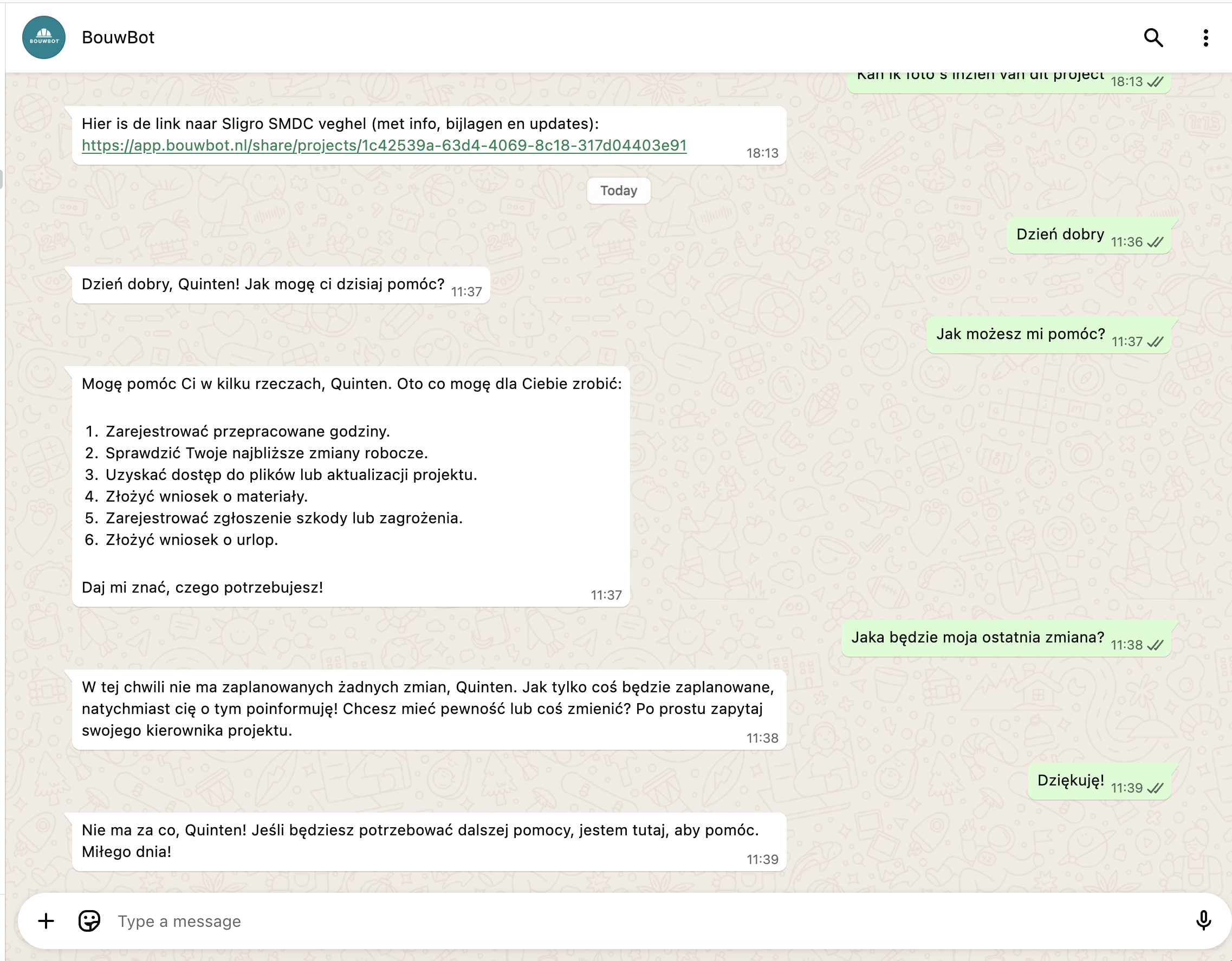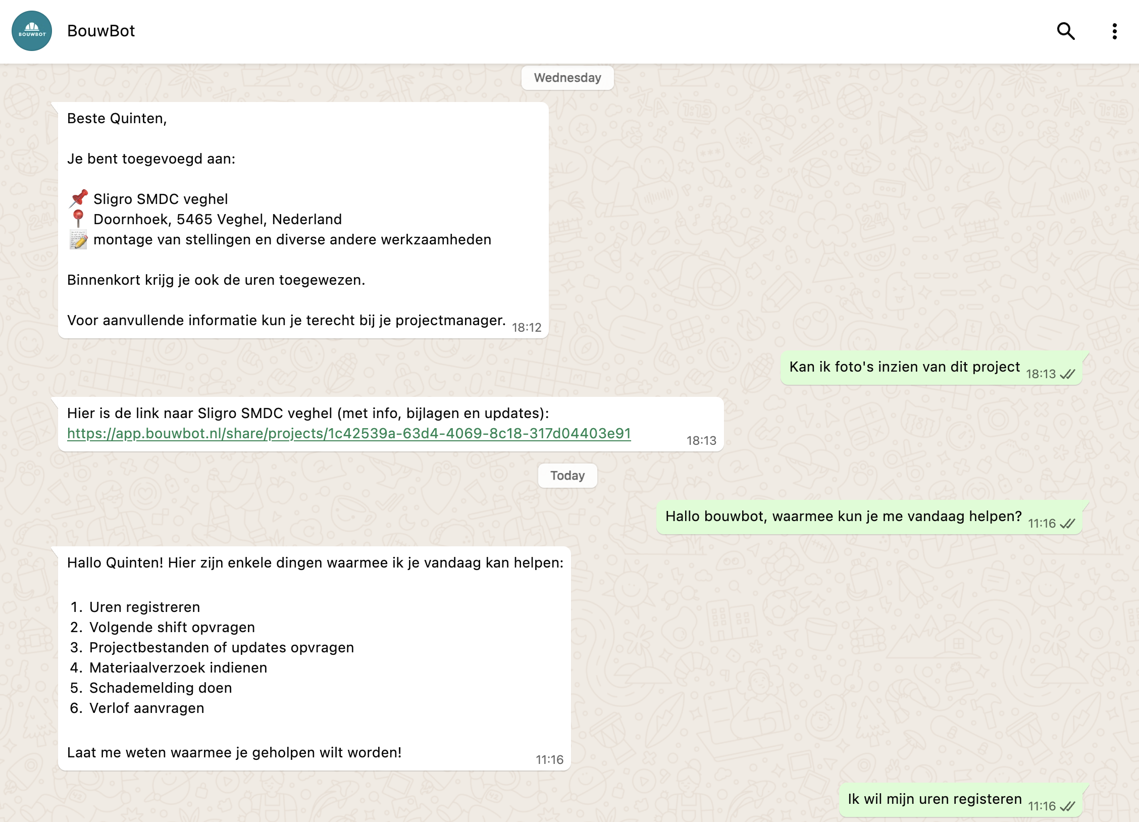 Vrijwel geen. Als iemand WhatsApp kan gebruiken, kan die met Bouwbot werken. Geen apps om te installeren, geen accounts om te onthouden!